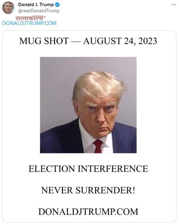 त्यांनी तुरुंगाकढून जारी करण्यात आलेला मगशॉटचा फोटो शेअर करताना म्हटलं, “निवडणूक हस्तक्षेप, शरणागती नाहीॅ”