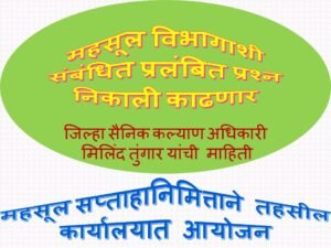 सोलापूर : जिल्ह्यातील सर्व वीर पत्नी, वीर माता, वीर पिता, माजी सैनिकांच्या विधवा पत्नी व सेवारत सैनिक व त्यांचे अवलंबित यांना महसूल सप्ताहानिमित्त शनिवार, दि. १० ऑगस्ट रोजी सर्व तालुक्यामध्ये आजी माजी सैनिकांसाठी महसूल दिवसाचे आयोजन करण्यात आले आहे. त्यादिवशी तहसीलदार व महसूल कर्मचारी आजी-माजी सैनिकांच्या महसूल संबंधित कामे करण्यासाठी तहसील कार्यालयात उपस्थित राहणार आहेत. त्यामध्ये विविध कामांचा समावेश करण्यात आला आहे.