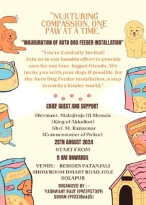 या उद्घाटन समारंभास प्रमुख पाहुणे म्हणून अक्कलकोट संस्थानचे राजे श्रीमंत मालोजीराजे भोसले, पोलीस आयुक्त एम. राजकुमार हे उपस्थित राहणार आहेत. या विशेष उपक्रमात सहभागी होऊन-रस्त्यावरील श्वानांची काळजी घेण्याची संधी सर्वांना मिळेल.