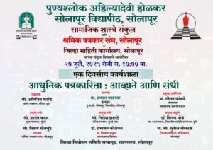 सोलापूर : पुण्यश्लोक अहिल्यादेवी होळकर सोलापूर विद्यापीठ, सामाजिक शास्त्रे संकुल आणि सोलापूर श्रमिक पत्रकार संघ तसेच जिल्हा माहिती कार्यालय, सोलापूर यांच्या संयुक्त विद्यमाने रविवार, दि. २० जुलै २०२५ रोजी सकाळी १०.३० वाजता सात रस्ता येथील जिल्हा नियोजन समिती सभागृह येथे “आधुनिक पत्रकारिता आव्हाने आणि संधी” या विषयावर एक दिवसीय कार्यशाळेचे आयोजन करण्यात आले आहे.
