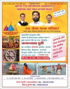 मोक्षदायिनी पुण्यदायक पवित्र भगवान श्री कृष्णाचे हृदय असलेले स्थान व मुख्य चारधामपैकी एक धाम विष्णुपीठ- जगन्नाथ पुरीसह जगप्रसिद्ध कोणार्क सूर्यमंदिर, भुवनेश्वर लिंगराज मंदिर, सिंहाचलम, अन्नावरम, पिठापुरम दर्शनीय यात्रा आयोजित केले आहे. ७ दिवसीय या यात्रेचा प्रवास रेल्वे आणि बसने असणार आहे. यात्रेकरूंसाठी निवास व भोजनाची व्यवस्था करण्यात येणार आहे.