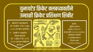 तरी ज्या खेळाडूंना या क्रिकेट शिबिरात सहभाग घ्यावयाचा आहे, त्यांनी पार्क मैदानावरील युनायटेड क्रिकेट क्लबच्या नेटवर क्लबचे सचिव सुनिल मालप (७५७८२१४६८१), सहसचिव संजय मोरे (९८९०८२३३५२), चंद्रशेखर लोखंडे (९९७५७७२७५८), चिराग शहा (९८५०२८१५२०) यांच्याशी सकाळी ६.३० ते ८.३० या वेळेत संपर्क साधून आपली नावे नोंदवावीत. त्याचप्रमाणे सदरची नावे सत्यम स्पोटर्स, पार्क स्टेडीयम गाळा नं. १७, अनमोल मिठाईशेजारी सतीश भोसले यांच्याकडे सकाळी १०.०० ते सायं.८.३० या वेळेत नोंदवावीत.