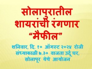 ही मैफील शनिवार, दि. १० ऑगस्ट २०२४ रोजी संध्याकाळी ७.३० वाजता उर्दू घर सोलापूर (छत्रपती शिवाजी महाराज सर्वोपचार रुग्णालय समोर) होत आहे. या मुशायरामध्ये सोलापूर तसेच सोलापुरातील ज्येष्ठ शायरांचा व नवोदित कवींचा सहभाग असणार आहे.