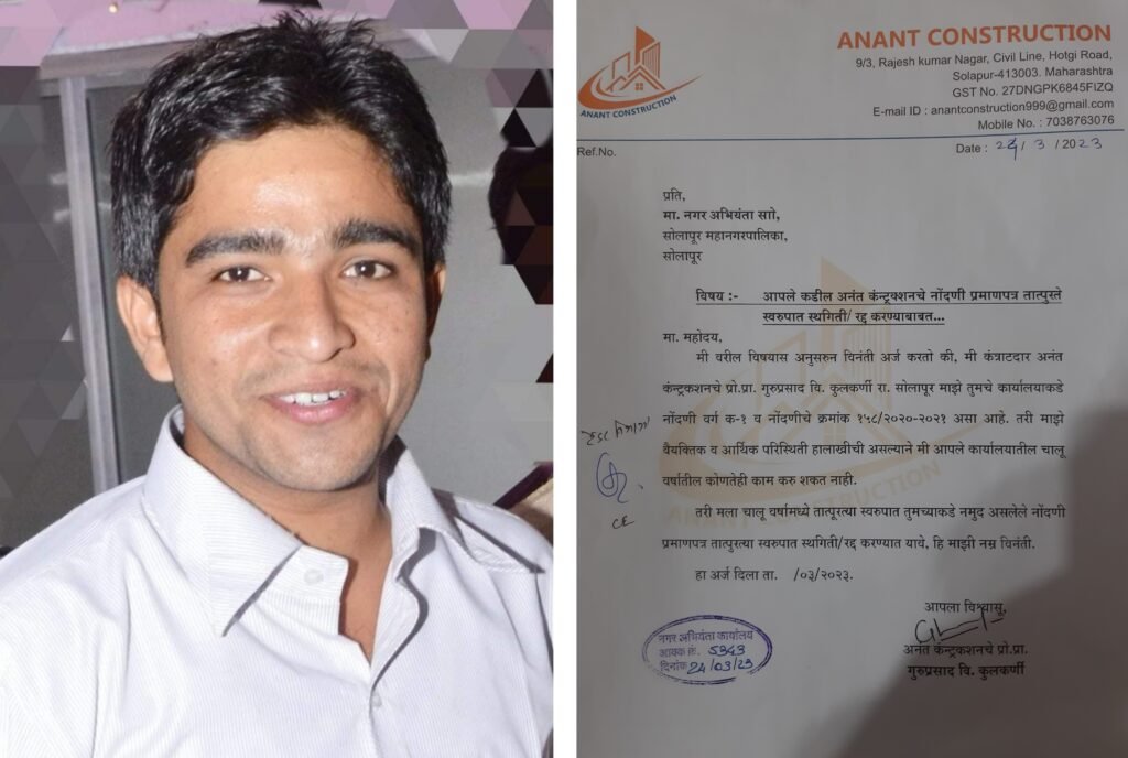 सोलापूर महापालिकेला (Solapur Municipal Corporation) खोटा बाँड देऊन मक्तेदारी मिळवणारा मक्तेदारा गुरूप्रसाद विलास कुलकर्णी यांनी 24 मार्च 2023 रोजी नगर अभियंता यांना नोंदणी प्रमाणपत्र दिले आहे. या पत्रात म्हटले आहे की, आपले कडील अनंत कंस्ट्रक्शनचे नोंदणी प्रमाणपत्र तात्पुरते स्वरूपात स्थगिती/रद्द करण्यात यावे. मी कंत्राटदार अनंत कंस्ट्रक्शनचे प्रो. प्रा. गूरूप्रसाद वि. कुलकर्णी, रा. सोलापूर माझे तुमचे कार्यालयाकडे नोंदणी वर्ग क-1 व नोदंणीचे क्रमांक 158/2020-2021 असा आहे. तरी माझे वैयक्तिक व आर्थिक परिस्थिती हालाखीची असल्याने मी आपले कार्यालयातील चालू वर्षातील कोणतेही काम करू शकत नाही. तरी मला चालू वर्षामध्ये तात्पुरत्या स्वरूपात तुमच्याकडे नमुद असलेले नोंदणी प्रमाणपत्र तात्पुरत्या स्वरूपात स्थगिती/रद्द करण्यात यावे, ही माझी नम्र विनंती.