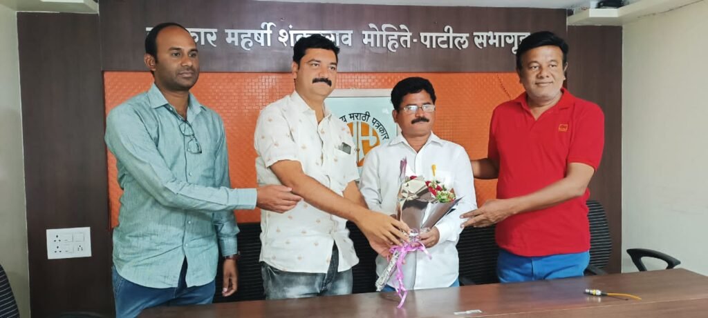 महाराष्ट्र राज्य मराठी पत्रकार संघातर्फे महापालिका पत्रकार संघाचे नुतन अध्यक्ष किरण बनसोडे यांचा सत्कार करताना महाराष्ट्र राज्य मराठी पत्रकार संघाचे अध्यक्ष मनीष केत, जेष्ठ पत्रकार प्रशांत माने आणि मराठी पत्रकार संघाचे सरचिटणीस वसीम अत्तार.